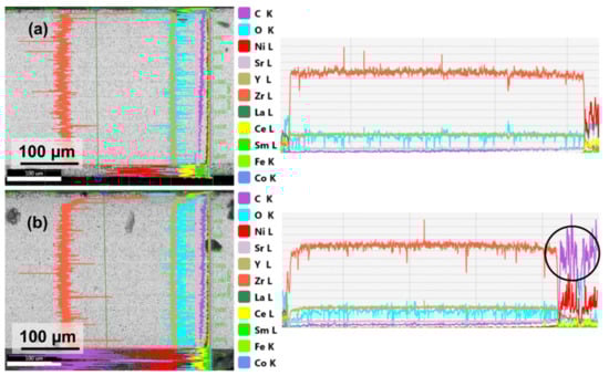 The maximum power density of the NS-GNP cermet anode operated in CH4 fuel was lower than that in H2, due to the accumulation and absorption of carbon into the microstructure of the anode. In SOFC, the improved permeability of the fuel gas through the anode microstructure increased the access to the active TPB regions, where the reaction occurred, resulting in reduced activation and concentration polarization. The presence of Ni accelerated the accumulation of carbon deposited on the surface of the Ni, blocked the gas-diffusion pores, and hindered the HOR in the anode []. As a consequence, SOFC performance was weakened by the deactivation of nickel cermet active sites for electro-catalytic activity. This carbon accumulation on the microstructure of the anode occurred by methane pyrolysis. To investigate the carbon deposition on the NS-GNP anode, the cross-section of the tested cells in the H2 and CH4 atmosphere was characterized by FESEM and EDX in line-scan mode, as shown in Figure 12. The high concentration of carbon species was observed in the CH4-fuelled NS-GNP anode, but no evidence of carbon accumulation was found in the H2-operated NS-GNP anode. Thus, the performance of the NS-GNP anode was reduced in a methane environment.