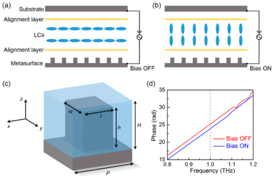 As shown in Figure 1a, the metalens is composed of the upper substrate, the lower dielectric metasurface and the middle LC layer. Both alignment layers covered on the substrate and metasurface provide a homogeneous pre-alignment for LCs along the x-axis. The substrate and metasurface should be conductive to electrically switch the LC orientation. In the THz band, silicon can be chosen for its high THz transmittance and conductivity [25]. When a saturated bias is applied on both the substrate and metasurface, LCs will reorient along the z-axis (Figure 1b). In this way, the phase modulation of the transmitted THz wave will change, resulting in a varied focal length. A rectangular silicon pillar meta-unit covered with LC is shown in Figure 1c with its dimension parameters. When illuminated with the x-polarized THz wave, each pillar can be regarded as an effective waveguide [26]. The phase of the transmitted wave can be given by neff · h · 2π/λ, where neff, h and λ are the effective refractive index, the pillar height and the incident wavelength, respectively. Thus, the simulated phase of the transmitted x-polarized THz wave exhibits a linear dispersion, as shown in Figure 1d. When the external bias turns from OFF to ON, the orientation of LC changes from x-axis to z-axis, contributing to a distinct phase shift (Figure 1d). This can be attributed to two factors. Firstly, the height H of LC is comparable to the THz wavelength. The refractive index change of LC from ne to no will induce a propagation phase variation. Secondly, the resonant property of the silicon pillar is sensitive to the surrounding refractive index. When the refractive index changes, the resonant frequency will shift, resulting in a phase shift.
