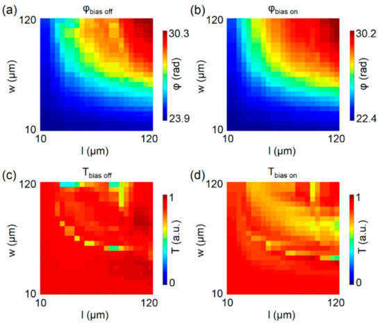 We fix h = 235 μm, P = 130 μm, H = 250 μm and target frequency at 1.0 THz, and then vary l and w both from 10 to 120 μm to achieve structural databases on the phase (Figure 2a,b) and the transmittance (Figure 2c,d), respectively, for x-polarized incidence. Observed from Figure 2a,b, the phase with a certain l and w value at bias OFF is larger than that at bias ON. As both l and w decrease from 120 to 10 μm, the phase difference become larger (from 0.1 to 1.5 rad). This is due to the different phase response to the electrically switched LC orientation with different l and w. We can properly select the pillar geometries to simultaneously achieve the desired lens phase distributions with two different focal lengths for bias OFF and ON cases. The criterion for the transmittance of each pillar is set to be over 0.7 to optimize the lens efficiency.