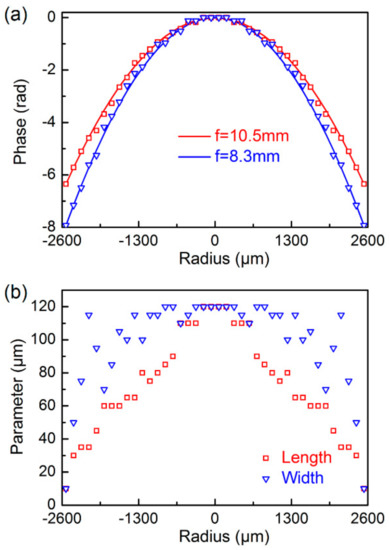 where r is the radius position on the lens, f is the focal length, the subscripts i and j indicate the different f at bias OFF and ON states. Here, fi and fj are designed as 10.5 mm and 8.3 mm, corresponding to the bias OFF and ON cases, respectively. The designed lens phase profiles with f = 10.5 and 8.3 mm are presented in Figure 3a. They are both parabolic in shape with varied curvature. By rationally selecting the l and w parameters at different r according to the database shown in Figure 2 and Equation (1), the parameters are decided and plotted in Figure 3b. The corresponding phases of different parameters are also plotted in Figure 3a. It can be seen that derived phases of these meta-units match well with the lens phase profiles at both bias OFF and ON states, indicating a satisfactory simulation parameter.