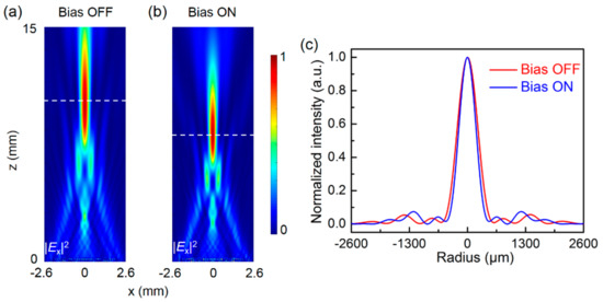 (a,b) Simulated THz fields in the xz-plane at 1.0 THz at (a) bias OFF and (b) bias ON states, respectively. (c) Transverse intensity distributions at the focal planes labeled by the white dashed lines in (a) and (b) at bias OFF (red line) and bias ON (blue line) states.