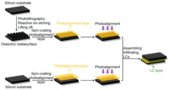 In addition to the numerical simulations, the feasible fabrication process of the LC integrated metalens is also discussed and schematically illustrated in Figure 5. The dielectric metasurface can be fabricated via the standard photolithography process followed by a reactive ion etching on an intrinsic silicon wafer. Afterwards, both the metasurface and silicon substrate are ultrasonically cleaned and O-plasma treated. After that, they are spin-coated with a photoalignment layer. Then, an exposure of a linearly polarized blue LED is applied to introduce homogeneous alignment on both the metasurface and substrate. Then, the metasurface and silicon substrate are assembled with a Mylar spacer to form a cell. Finally, the large-birefringence LC with a birefringence of 0.3 at 1.0 THz is infiltrated and self-assembled to the desired orientations. The experimental characterization of the fabricated device can be carried out with the photoconductive antenna or optical rectification-based THz generator and detector.