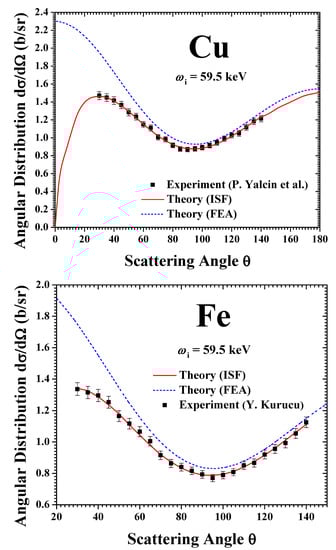 For the angular distribution of Compton scattering process, the theoretical and experimental results of Fe and Cu are presented in Figure 4. In this figure, the incident photon energy is keV. We choose Fe and Cu elements as representative examples of elemental metal and ferromagnetic metal, respectively. Results of other elements exhibit a similar behavior, and they are not displayed in this figure. The readers could find more examples in references [79,80,81,82]. The experimental measurements from references [80,81] and the theoretical predictions of FEA and ISF approaches [81,82] are plotted in this figure. In reference [82], the scattering function is calculated using Equation (30) in RIA framework [81,82] (Please note that in Section 4, we have mentioned that the scattering function can be obtained from RIA, Waller-Hartree theory, and other methods. In particular, within the RIA framework, the scattering function is calculated through the integration of Compton profile , see Equations (30)–(33).). The results in Figure 4 indicate that ISF is a better approach than FEA in calculating the angular distribution for Compton scattering process. The ISF results successfully reproduce experimental measurements at all angles, while the FEA results can bring about large discrepancies in the small angle regions. In this region, both the energy transfer and momentum transfer in Compton scattering process are very small, so that atomic electrons cannot be viewed as free electrons anymore. In the low-energy and low-momentum transfer region (correspond to small scattering angle ), only a small percentage of bound electrons in atomic or molecular systems are activated in the Compton scattering process. Therefore, the FEA results, in which all electrons are treated as free and activated, would tremendously overestimate the angular distribution of Compton scattering process.