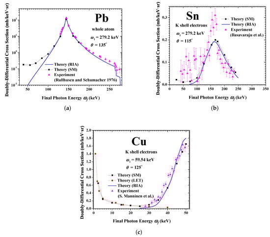 DDCS of Compton scattering for Cu and Pb elements. In this figure, the vertical axis labels the DDCS , and the horizontal axis labels the final photon energy . The subfigures (a–c) correspond to the following cases: (a). Compton scattering for Pb atom at keV and ; (b). Compton scattering for K-shell electrons of Sn atom at keV and ; (c). Compton scattering for K-shell electrons of Cu atom at keV and . The experimental measurements are given by references [83,84,85]. The theoretical predictions from RIA and SM approaches are given by Qiao et al. and Bergstrom et al. [28,42,54].