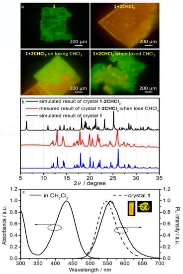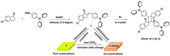 Compound 1 is a new compound and is synthesized according to the literature (Figure 1) [19]. At 0 °C, 1.0 g NaOH in 2 mL H2O was dropwise added to the mixture of 5-chloro-1-indanone (1.66 g, 10 mmol) and 4-(diphenylamino)benzaldehyde (2.73 g, 10 mmol) in 60 mL ethanol. The mixture was stirred for 1 h. The yellow precipitates were filtered out, washed with water and cold ethanol, and then dried as crude product. Two kinds of crystals were prepared (Figure 1), which are a pure crystal phase (crystal 1) and a CHCl3-containing co-crystal phase (crystal 1•2CHCl3). The crystals were prepared as follows: in a round bottom flask, the crude product (1.0 g) was dissolved with THF or CH2Cl2 (40 ml) to obtain a concentrated solution and triple amount of methanol was slowly added along the flask-wall without destroying the solution surface. After 48 h at 0–5 °C, plenty of green-yellow emissive crystals precipitated out (named as crystal 1, Figure 2a), and the structure was characterized by NMR spectroscopy. Using the CHCl3/ethanol (20 ml CHCl3 and 60 ml ethanol) system always gave rise to two kinds of crystals, the flaky green-yellow emissive crystal 1 and the blocky orange-red emissive crystal 1•2CHCl3 (named as 1•2CHCl3 because it contains two-equivalent CHCl3 molecules, Figure 2a). As shown in Figure 2c, compound 1 displays an intense absorption band peaking at 432 nm in CH2Cl2. Its solution is yellow fluorescent (558 nm). Compound 1 is brightly emissive in the crystalline state. The pure crystal phase 1 shows green-yellow emission (546 nm) with the fluorescence quantum yield of about 0.22 (Figure 2a,c), and its fluorescence lifetime is about 3.47 ns (Supplementary Figure S1). The co-crystal phase 1•2CHCl3 shows orange-red emission (Figure 2a). However, due to the rapid volatilization of CHCl3 molecules, the crystal would quickly deteriorate when separated from the crystallizing mother solution, and its emission color then switched to green (Figure 2a), indicating the crystals displays CHCl3-dependent emission color. This also results in the lack of data for crystal 1•2CHCl3, including the emission spectrum as well as other photophysical data. The PXRD pattern of crystal 1•2CHCl3 when losing CHCl3 is strictly the same as that of crystal 1 (Figure 2b), demonstrating that the chalcone molecules in 1•2CHCl3 have the same packing mode as those in crystal 1 and CHCl3 molecules just fill in the crystal without changing the main molecular network. Nevertheless, considering the fact that crystal 1•2CHCl3 shows obviously redshifted emission compared with crystal 1, CHCl3 must be involved in the molecular orbitals and plays a key role in red-shifting the emission. This is not ordinary because CHCl3 is just a solvent molecule and has no aromatic rings. Additionally, when fuming with CHCl3, the desolvated yellow block (1•2CHCl3 when losing CHCl3) would gradually become orange (Supplementary Figure S2), further confirming the significance of CHCl3 on tuning the energy band of this type chalcone derivative.