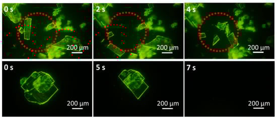 Figure 3. A series of microscopic images showing the jumping and splitting behavior of crystal 1 under UV light (crystals jump away and back in the red circle).