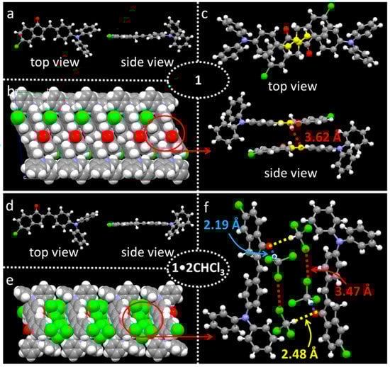 Figure 4. Crystal structures of the pure crystal phase 1 (ac) and the co-crystal phase 1•2CHCl3 (df): (a) top view and side view of the molecule; (b) special “molecular pairs” packing mode along crystallographic b diresction; (c) side view and top view of the “molecular pair” with short distance between the two vinyl groups (marked in yellow); (d) top view and side view of the molecule; (e) “molecular pairs” packing structure along crystallographic b direction with large amounts of CHCl3 filling in the crystal and (f) strong interactions between the two molecules of compound 1 and four CHCl3 molecules.
