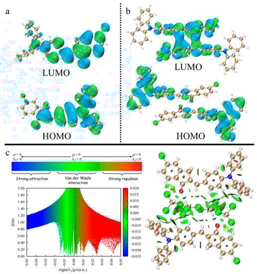 Figure 5. The calculated HOMO and LUMO molecular orbitals of compound 1 in (a) monodisperse state and (b) “molecular pair” state, the colors of lime and cyan are positive and negative phase; (c) The RDG isosurfaces as well as color-filled map of RDG versus the product of second Hessian eigen and electron density for the CHCl3-containing system.