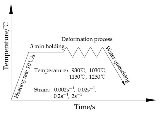 The experiment was carried out on Gleeble-1500D thermo-mechanical simulator (Data Sciences International, St. Paul, MN, USA). The heating rate of the specimen was set at 10 °C/s. After the sample was heated to the experimental temperature, it was kept for about 3 min to make the internal temperature distribution of the sample uniform. Then the hot compression experiment was carried out. In this hot compression experiment, the temperature was 4 groups, the gradient was 100 °C, the strain rate was 0.002, 0.02, 0.2, 2 s−1, and the strain was 0.916. After the test, the hot compression deformation structure was retained by water quenching. The temperature change during the test is shown in Figure 1.