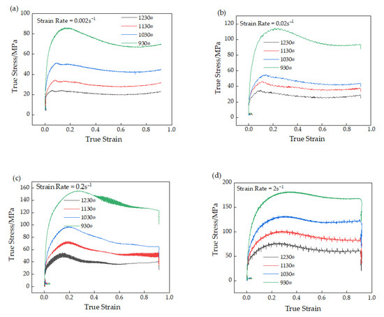 Stress-strain curves of 20MnCr5(SH) gear steel at different strains with temperature of (a) 0.002 s−1; (b) 0.02 s−1; (c) 0.2 s−1; (d) 2 s−1.