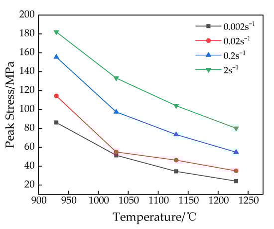 The variation of peak stress with temperature is shown in Figure 3. It can be found that the higher the temperature is, the smaller the deformation resistance, the smaller the strain rate, and the smaller the deformation resistance.