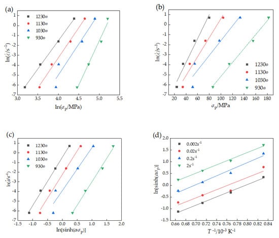The linear relationships of (a) ln–lnσp; (b) ln–σp; (c) ln–ln[sinh(ασp)]; (d) 1000/T–ln[sinh(ασp)].