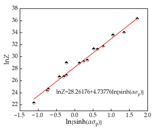 The relationship between lnZ and lnsinh(ασp) is shown in Figure 6. The Arrhenius flow stress constitutive equation of 20MnCr5(SH) during hot deformation can be obtained by substituting various material constants into Equation (8), which is shown in Equation (11):