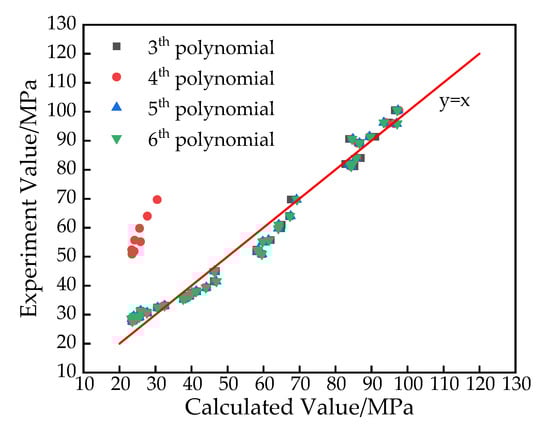 Figure 7 is a scatter diagram composed of experimental stress and calculated stress. The scatter diagram can more intuitively show the prediction ability of the strain correction constitutive equation. The closer the scatter point is to the straight line y = x, the polynomial fitting of order 4 can significantly deviate from the prediction of stress scatter point y = x, which further proves that the previous evaluation of order 4 has the largest relative error.