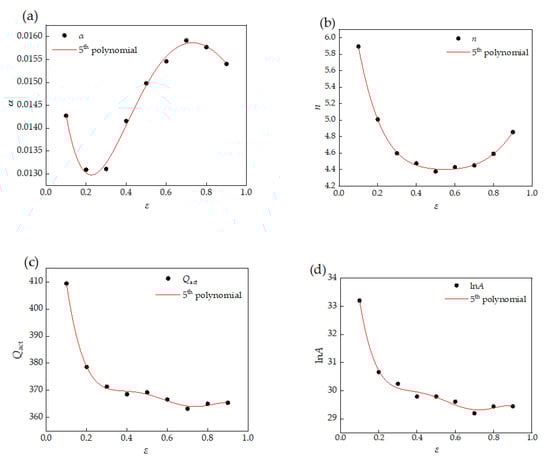 The traditional Arrhenius flow stress constitutive equation simply uses peak stress to describe the relationship between stress and strain at different temperatures and strain rates. The material parameters in the default model are all constant, and the effect of strain on the constitutive model is not considered in the process of modeling. Various evidences show that each material constant in the constitutive equation is not a fixed value, but a mapping relationship with strain [25,26]. Therefore, it is necessary to modify the traditional Arrhenius constitutive equation.