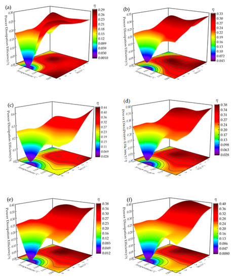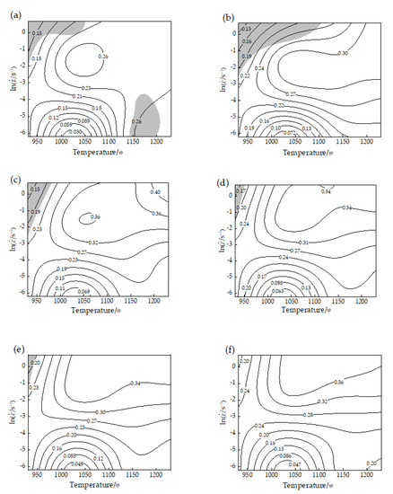Power dissipation maps for the 20MnCr5(SH) gear steel at strains of (a) 0.1; (b) 0.2; (c) 0.3; (d) 0.4; (e) 0.5; (f) 0.6.