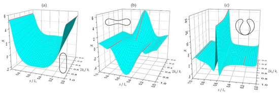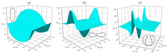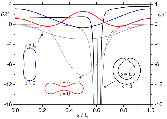 Figure 1 shows the typical, qualitatively different, and axially symmetric structures considered in our study and their essential geometric properties, i.e., a spatially varying Gaussian curvature (Equation (7b)) and a nonvanishing deviatoric curvature (Equation (7c)), both expressed as functions of the arc length s along the generating profile. They are commonly dubbed stomatocytes, oblates, and prolates, and are depicted in black, red, and blue color, respectively. The key parameter determining their stability is the reduced volume . Stomatocytes are stable for a relatively low values. Their salient feature is a narrow neck where , whereas elsewhere . Prolate-type shapes are stable for relatively large values of . The Gaussian curvature is maximal at poles and the deviatoric curvature has maximal absolute value at the equatorial region. At intermediate values oblate-type structures are stable. In them, the positive Gaussian curvature and the absolute value of deviatoric curvature exhibit a pronounced maximum at the equatorial region.