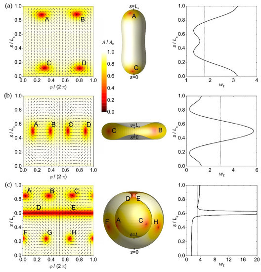 In Figure 2, we plot the extrinsic curvature potential for the representative prolate (Figure 2a), oblate (Figure 2b), and stomatocyte (Figure 2c) shapes for varying and . The diagrams reveal a curvature-preferred local orientation of . Furthermore, regions with a large enough do not favor the presence of TDs. In Figure 3, we present the total curvature potential for these shapes for varying s and , which measures the relative importance of extrinsic and intrinsic curvature contributions. One sees that has a particularly strong impact on oblate shapes (Figure 3b). Typical equilibrium configurations (shapes and nematic textures) in the absence () and for a relatively strong presence of extrinsic curvature contribution ( are plotted in Figure 4 and Figure 5, respectively. In the first panels, we plot nematic configurations in the plane. Centers of defects are revealed by regions where and we mark them with capital letters A, B. The linear size of defect cores, where the nematic order is essentially melted, is roughly given by In the second panels, we plot shapes of closed nematic shells, where we also indicate the location of TDs. In the third panels, we plot dependence of corresponding shapes. One sees that maxima of are indeed attractors of TDs.