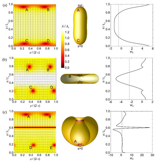 Intrinsic curvature dominated order parameter profiles, equilibrium membrane shapes and the corresponding profiles for (a) prolates, (b) oblates and (c) stomatocytes. The nematic director field is superimposed onto the order parameter profile in the ()-plane. The function was calculated for . Positions of TDs are denoted with capital letters. Ls stands for the length of the profile curve. Parameters: (a) v = 0.80, (b) , (c) ; , , .