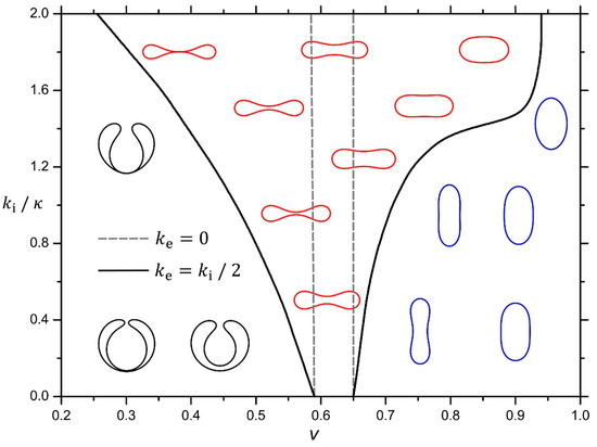Stability diagram of equilibrium closed membrane shapes as a function of relative volume in the presence (, solid line) and in the absence (, dashed line) of the extrinsic contribution. Profiles of stable shapes presented in the diagram for different values of the reduced volume and were calculated in the presence of the extrinsic term (). Stomatocyte shapes are colored in black, oblate shapes (including discocyte shapes) in red and prolate shapes in blue. .