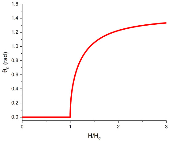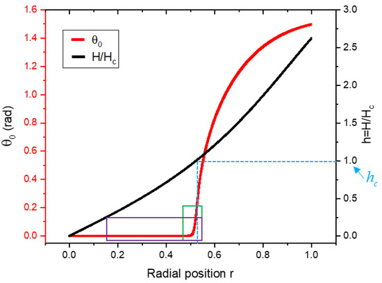 Our results indicate that in our cell with strong homeotropic orientation, the director remained partially aligned with the radial magnetic field even in those regions of space where the magnetic field amplitude was below the critical value . That is to say, unlike in the case of the classical Freedericksz transition, here for all ; the spatial variation of the field amplitude has therefore fundamentally changed the nature of the transition. The reason for the change can be understood from elementary considerations. At large values of r, near the outer edge of the cell, the field is strong; and the director field in the midplane of the cell is expected to be well aligned with the field, as in the classical case in Equation (1). Nearer the center, the field magnitude is reduced, and hence the alignment will also be reduced, as in the classical case. In the region where H is just above , however, cannot depend on the field as in Equation (1); if it did, the gradient of the director field would diverge with diverging elastic energy density. So instead of abruptly decreasing to zero, must decrease gradually, as shown in Figure 8b. Numerics indicates that the decrease remains gradual and exponential-like, as suggested by Figure 8a.