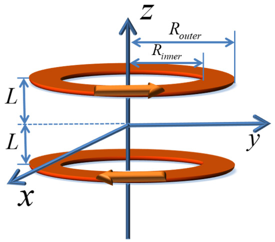 The radially symmetric magnetic field was generated by a ring formed from truncated wedge-shaped rare-earth magnets. Each magnet is viewed as a surface current loop. Due to cancellation of surface currents at the contact planes, there are two current annuli flowing in opposite directions (counterclockwise and clockwise) on top and bottom of the ring magnet as shown in Figure 3.