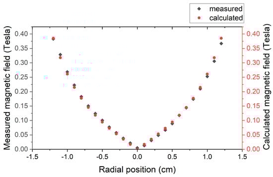 The calculated and measured magnetic fields in the midplane as a function of radial position are shown in Figure 4; they agree to with . The field is zero at the center due to symmetry and increases initially linearly with radius r.