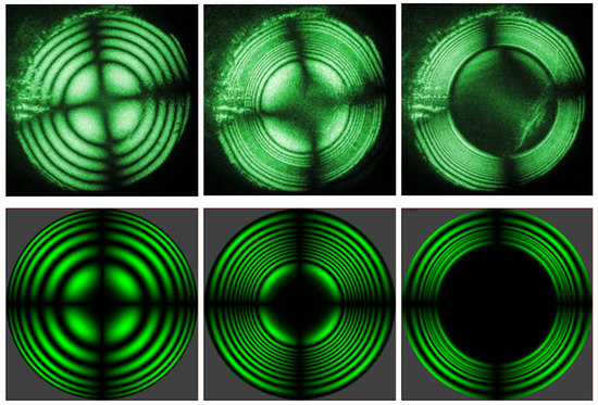 Magnified far field interference patterns on a screen were observed and photographed (top row) in Figure 5 as the magnet was translated along the symmetry axis. On either side of the midplane, the magnetic field has nonzero z components, as does the director field. The pattern on the left was captured when the sample was outside the ring, the pattern in the middle is when the sample is in the ring, but not yet at the midplane, and the pattern on the right is when the sample is in the midplane. The corresponding patterns on the bottom row in Figure 5 are calculated, based on the director field configuration obtained from energy minimization [9,10].