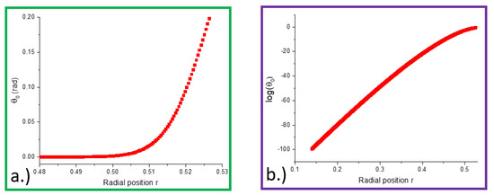 Determination of the director pattern in the spatially varying field is the central aspect of this work. With the sample at the midplane of the ring magnet, Figure 7 shows the director angle in the midplane of the sample, half-way between the plates. The magnetic field is radial, increasing monotonically with r as shown. The angle changes rapidly in the vicinity of where the field is below the critical value. Although superficially the plot of vs. r is similar to Figure 1, as the magnified portions in Figure 8 indicate, instead of falling abruptly to zero, decreases more slowly, the curvature of the curve changes sign as seen clearly in Figure 8b, and although is small, it is nonzero, decreasing apparently exponentially as shown in Figure 8a towards the origin.