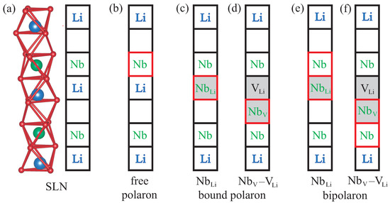 In the absence of defects, an additional electron introduced into the material will localize at one of the regular Nb atoms, as indicated by the red square in Figure 1b. Together with the resulting lattice relaxation, this gives rise to the free polaron. Congruent LN, on the other hand, features a high concentration of Nb antisite defects. In this scenario, an additional electron will localize at the defect site instead, creating a bound polaron as in Figure 1c. The Nb antisite atom can also migrate into the next empty oxygen octahedron, producing a Nb–V defect pair. This configuration can likewise host a bound polaron, depicted in Figure 1d. If not one but two electrons are added to the system, then a bipolaron forms either at the antisite, Figure 1e, or the defect pair, Figure 1f. All defect structures illustrated in Figure 1 are considered in this work.