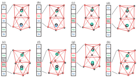 Lithium niobate belongs to the trigonal crystal system with the space group [8]. Its crystal structure consists of octahedral cages formed by oxygen atoms. The cationic sites inside the oxygen cages can either be occupied by a lithium or niobium ion, or remain empty. For defect-free stoichiometric lithium niobate (SLN), the stacking order along the threefold symmetry axis is a periodic repetition of the sequence Li–Nb–vacancy as illustrated in Figure 1a. Due to the ferroelectric distortion, which breaks the inversion symmetry, the cations do not reside in the geometric center of the oxygen cages but are slightly displaced in the vertical direction. To highlight point defects in LN, which can be characterized by a modified occupancy of the cationic sites, we use a schematic representation where each square symbolizes a filled or empty oxygen octahedron.