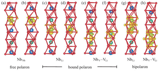 Lastly, the Nb–V defect pair may be regarded as a modification of the Nb antisite defect where the antisite Nb atom migrates into the neighboring empty oxygen octahedron [12]. Concomitantly, as evidenced in Figure 4, the uppermost displayed Li atom also shifts into the neighboring empty octahedron for all models involving the defect pair. The pair of the Nb and Nb atoms in the two adjacent oxygen cages that host the bipolaron ultimately bears a strong resemblance to the pair of neighboring Nb and Nb atoms in the case of the antisite defect if turned upside down, which can clearly be seen by comparing Figure 4g,h. Due to the very similar local environment, it is not surprising that the charge densities of the bipolarons at the two defects are also almost identical. In particular, the hybridization, which has a twice as large effect on the bipolaron than on the one-electron bound polaron, again explains the relaxation to an axially symmetric configuration.