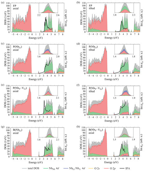 Within the IPA, the resonances in the optical spectrum correspond directly to transitions between occupied and unoccupied one-particle states. For congruent LN, the lowest-energy transitions are expected to occur between occupied defect levels inside the band gap and the conduction-band edge. As each of our simulations features only one polaron type and hence a single defect level that acts as an initial state, the low-energy region of is akin to the density of final states in the conduction band, modified by the transition dipole moments. In order to align the curves, we shift the IPA spectrum on the energy axis in Figure 5 so that the defect level, whose dispersion is negligible for the 2 × 2 × 2 supercell used here [27], is taken as the origin. Besides, the spectra are cut at 3 eV, so that transitions at higher photon energies from bulk valence to conduction bands across the band gap are left out. Indeed, for all polaron types, the onset of the absorption, where the imaginary part of the dielectric function assumes nonzero values, coincides precisely with the energy separation between the defect level and the conduction bands in the density of states.