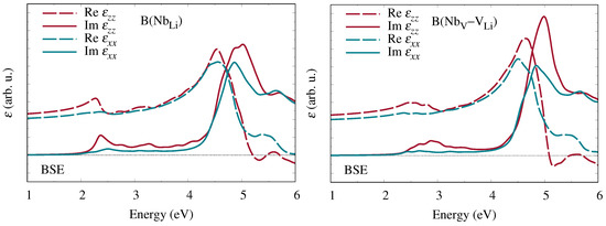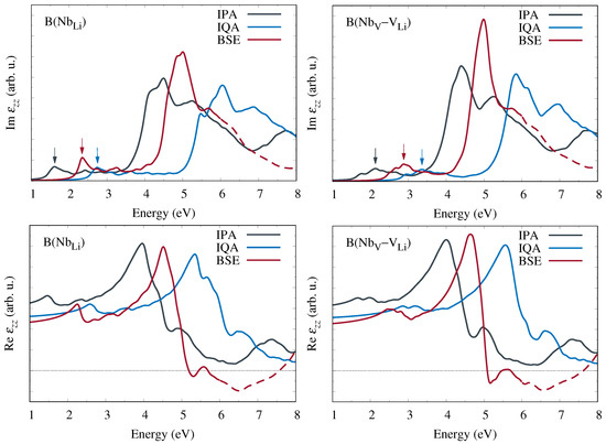 In Figure 6, we display the imaginary (top panels) and real (bottom panels) parts of the dielectric function for bipolarons localized either at the Nb antisite defect (left) or at the Nb–V defect pair (right) for the different approximations. The IPA results are the same as in Figure 5g,h but are here displayed with no shift on the energy axis and calculated with a different -point mesh for consistency with the other schemes. Equivalent results for in relation to Nb–V can be found in [12]. The resonances at low photon energies, where the dielectric function of stoichiometric LN has no structure [30], arise from the defect-related optical transitions and are characteristic of the specific polaron type. In contrast, bulk transitions dominate at energies larger than the band gap, for example above 3 eV in the case of the IPA. The most pronounced defect-related peak, indicated by the arrow, appears at a lower energy for bipolarons at the Nb antisite defect than at the Nb–V defect pair. If quasiparticle corrections from the approximation are included, then the band gap increases significantly. Consequently, the dielectric function in the IQA (blue lines) is blueshifted by about 2 eV with respect to the IPA, whereas the shape of the spectrum remains essentially unchanged. In contrast, including electron-hole attraction effects within the BSE (red lines) entails a significant redistribution of spectral weight that enhances the oscillator strengths near the absorption thresholds due to the formation of excitons. In addition, there is a redshift that positions the final spectrum roughly halfway between the IPA and IQA curves. Because of the small number of bands, the BSE results are not fully converged above 6 eV and hence depicted by dashed lines in this region.