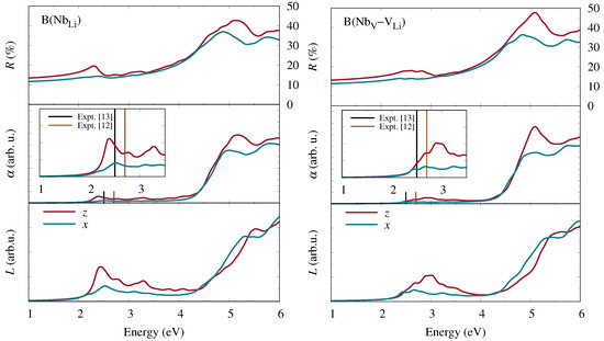Optical properties derived from the dielectric function within the BSE: reflectivity R (top), absorption coefficient (middle), and electron-energy-loss function L (bottom) for z-polarized (red) and x-polarized (blue) light. The left panels correspond to bipolarons at a Nb antisite defect, the right panels to bipolarons at a Nb–V defect pair. In the plots of the absorption coefficients, vertical lines indicate the position of the absorption band assigned to bipolarons in different experiments [12,13].