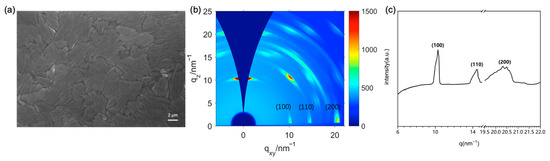 (a) The SEM image; (b) 2D GIXRD pattern and (c) 1D GIXRD spectra derived from (b).