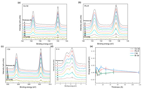 (a) Cs 3d, (b) Pb 4f, (c) I 3d and (d) Br 3d core level spectra at the CuPc/CsPbI2Br interface. (e) The evolutions of core-levels as functions of CuPc thickness. The binding energies of the core-levels are referred to those of the pristine CsPbI2Br film.