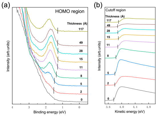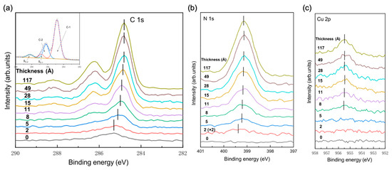 Figure 3 shows the evolutions of C 1s, N 1s and Cu 2p for the CuPc film as functions of film thicknesses. In C 1s spectra (cf. Figure 3a), the peak at 285.5 eV for the pristine CsPbI2Br film is assigned to adventitious carbon [36]. Features corresponding to CuPc appear and become dominant after 5 Å deposition. The inset shows the fitting curve for C 1s spectrum at a CuPc thickness of 117 Å. The C-1 (284.8 eV) and C-2 (286.2 eV) are assigned to aromatic carbon of the benzene rings and pyrrole carbon linked to nitrogen, respectively, with corresponding shake-up features located at higher binding energy of 286.8 eV and 288.2 eV, which agrees well with previous reports [37,38,39]. No additional features in C 1s spectra are observed, suggesting no chemical bonds formed between CuPc and CsPbI2Br. The peak positions of C-1 feature are guided by solid bars in Figure 3a, which shift to lower binding energy continuously by ~0.23 eV from 2 Å to 117 Å. The thickness-dependent N 1s and Cu 2p spectra are shown in Figure 3b,c, respectively. It is noticed that N 1s peaks shift almost identically to the lower binding energy side by ~0.23 eV. Although Cu 2p cannot be resolved below 5 Å due to the very low atomic concentration of Cu, it also shifts with increasing thicknesses to lower binding energy. The local shift of all core levels in the same fashion is the characteristic for the band bending [40,41]. In summary, all the photoemission peaks from the CuPc shift towards lower binding energy continuously during evaporation, pointing to an upward band bending at the CuPc side of the CsPbI2Br/CuPc interface.