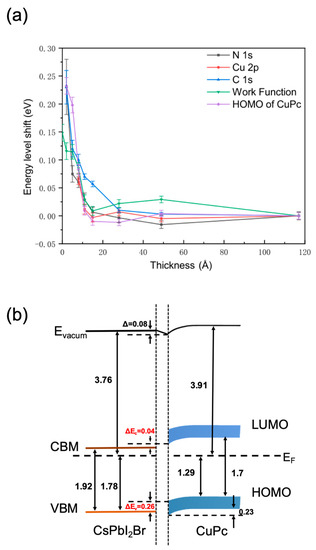 (a) The relative energy level shifts of N 1s, Cu 2p, C 1s, CuPc HOMO and WF as functions of CuPc thickness. The energies refer to those of the 117 Å CuPc. (b) The energy level diagram at the CsPbI2Br/CuPc interface.