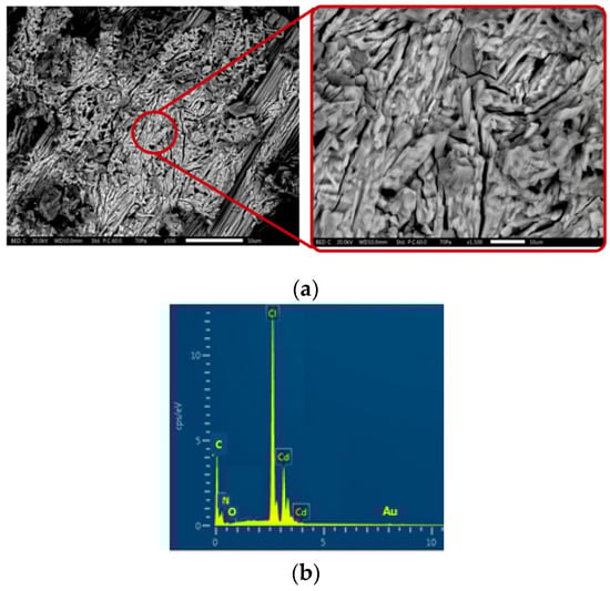 Additionally, in order to verify the elements present in the studied material, the EDX profile has been recorded and is shown in Figure 1b. The spectrum confirms the presence of Cd, Cl, N, C, and O in the target material.