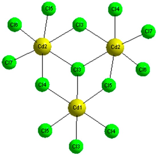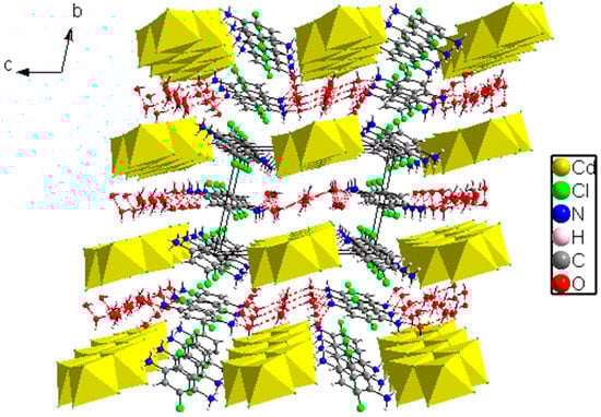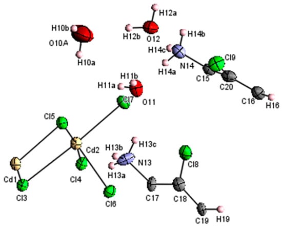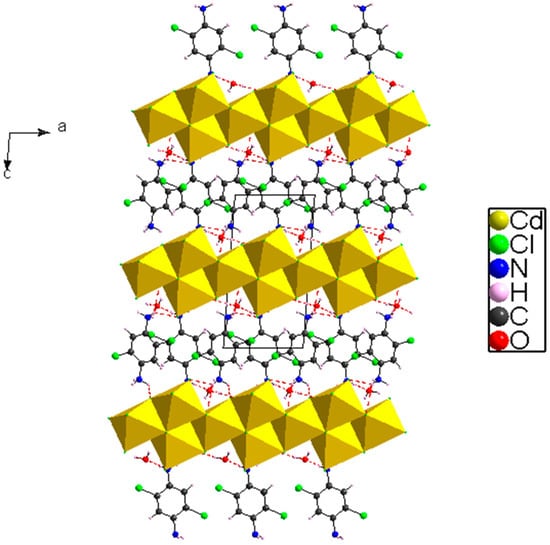The crystal packing is formed by a polymeric chains of [Cd3Cl10]n4n− anions propagating parallel to the a-axis (Figure 4). These chains, located at z = ½, are made by edge-sharing CdCl6 octahedra, where the [C6H8Cl2N2]2+ and H2O are inserted between these chains.