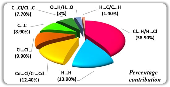 Figure 8 contains the percentages of the different interactions. The 2D fingerprint plot reveals that H…Cl/Cl…H contacts are the most encountered interactions and their relative contribution reaches 38.9%, as shown in Figure 9a, due to the abundance of chloride and hydrogen on the molecular surface (%SCl = 39.4% and % SH = 35.65%) with an enrichment ratio EHCl = 1.38. Indeed, the structure cohesion is ensured by three N-H…Cl hydrogen bonds (Table 4). The H…H contact represent 13.9% (Figure 9b). The Cd…Cl/Cl…Cdis around 12.4% (Figure 9c) with an enrichment ratio ECdCl = 2.49, followed by Cl…Cl 9.9% (Figure 9d) and C…C 8.9% (Figure 9e). The Cl…Cl intermolecular interactions are marked by a low amount of enrichment ratio EClCl = 0.63 due to the electrostatic repulsion between two charges of the same sign. The C…C contacts have the most enrichment value, ECC = 4.9, due to the accumulation of aromatic nuclei in the crystalline packing SC = 13.45%. Other interconnects, such as C…Cl/Cl…C 7.7% (Figure 9f), H…C/C…H 1.4% (Figure 9h) and Cd…H/H…Cd 0.2% (Figure 9i) contributes less to the surface. The C…Cl, H…C and Cd…H interactions are; ECCl = 0.72, EHC = 0.14 and ECdH = 0.04. The low enrichment ratio value reveals that pairs tend to avoid contact with each other. Finally, the percentage of H…O/H…O intermolecular interactions is around 3% (Figure 9g) and they are over-represented (EHO = 2.8). Indeed, there are three N-H…O and three O-H…O hydrogen bonds in the structure (Table 4).