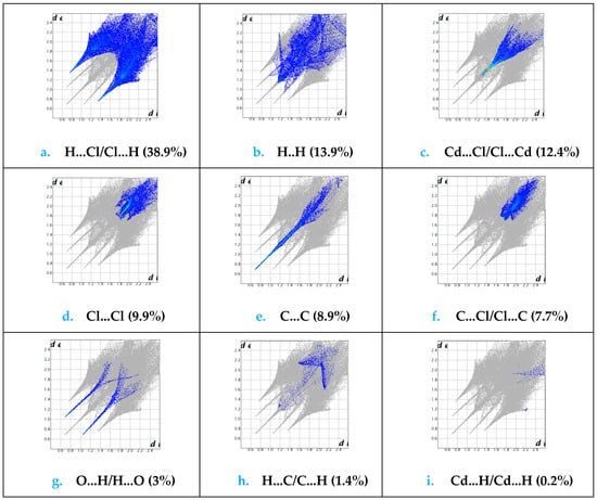 Fingerprint plots showing contribution from different contact. (a) H…Cl/Cl…H, (b) H…H, (c) Cd…Cl/Cl…Cd, (d) Cl…Cl, (e) C…C, (f) C…Cl/Cl…C, (g) O…H/H…O, (h) H…C/C…H, (i) Cd…H/H…Cd.