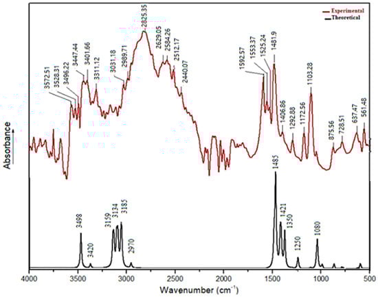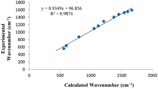 The DFT-IR spectrum and the experimental spectrum, given in Figure 10, are very similar. In Figure 11 a nice straight-line correlation was observed. It is worth considering that when comparing both experimental and theoretical results, the theoretically predicted parameters were calculated in a simulated water phase, and this latter is so far from the experimental environment. Subsequently, small deviations should not be surprising. Even so, the results demonstrate a good agreement, which is well-confirmed by the correlation (R2 = 0.987) that is mostly achieved in the fingerprint region.