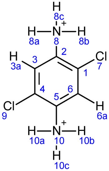 The approach is based on the identification of the hydrogen bond acceptor sites, as their sites with the hydrogen bond donors have the potential to afford organized crystalline arrays in different dimensions [,,]. In fact, amines are commonly selected as potential hydrogen bonding donors and metal halides are particularly considered as strong hydrogen bond acceptors. Particularly, 2,5-dichloro-p-phenylendiamine is an organic molecule which contains two amino groups on the aromatic ring. It is a good template presenting both rigidity and flexibility and is also rarely studied. The non-planarity and the stabilization of the amine is the result of a balance between two opposing forces: the conjugation of the nitrogen lone pair with the aromatic ring []. This latter is a very useful in several fields such as microelectronics and electromagnetic sensors, due to the high environmental stability, and controllable electrical conductivity [,,]. However, it should be emphasized that solid-state structures arise from a balance of intermolecular forces. Although stronger forces may dominate, weaker forces (donor-acceptor interactions, and dispersion forces) are also important and may lead together to the development of the three-dimensional network [].The association of protonated organic cations and metallic-based moieties, either anions or polyatomic clusters, led to a remarkable diversity of assemblies. As metal halides, halocadmates(II) have received considerable attention thanks to their polymorphic behavior, electronic configuration, and lattice location. Moreover, their structural diversity is the key issue in semiconductor physics, supramolecular studies, and bioinorganic studies [,,,].