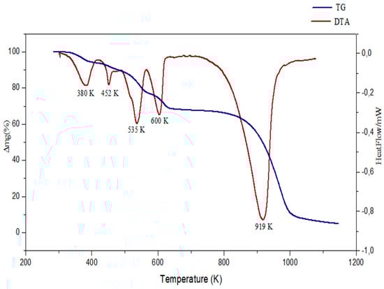 Thermal analysis is one of the most useful methods of analysis in collecting both physical and chemical information. For this reason, we chose (TG/DTA), the most used technique of thermal analysis in providing information about the bonding of components within the sample. The TGA and DTA measurements, in the range 200–1200 K, are depicted in Figure 16.