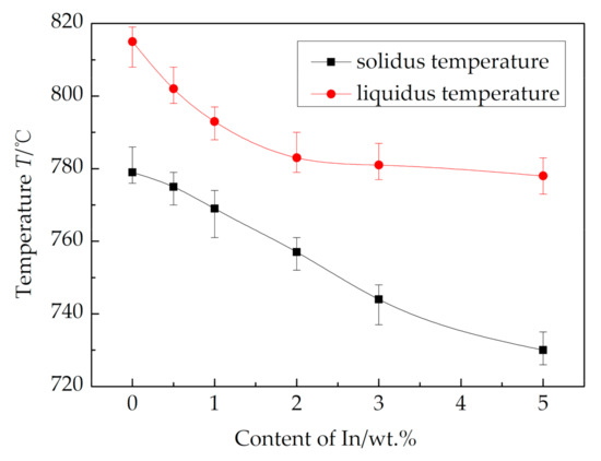 In produces twice as much annually as Ga and the price is relatively lower. When the In content of 30Ag–Cu–Zn–In filler metal is from 0 to 3%, the solidus temperature (Ts) and liquidus temperature (Tl) of 30Ag–Cu–Zn filler metal decrease from 690 to 652 °C and from 770 to 710 °C, respectively [7]. The distinct decrease of both Ts and Tl of the filler metal is mainly attributed to the fact that the melting point of In is only 156.61 °C, as shown in Figure 1; appropriate amounts of indium can dissolve in copper and silver to form silver-based and copper-based solid solutions with lower melting points [8].