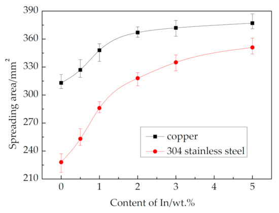 Wettability refer to the ability or tendency of a liquid to spread on a solid surface, the greater the spreading area of the brazing filler metal on the substrate, the better the wettability [13]. Figure 3 shows the spreading test results of 12Ag–Cu–Zn–Sn–xIn alloys on copper and 304 stainless steel plates at the temperature of 850 °C. As shown in Figure 3, 12Ag–Cu–Zn–Sn exhibited excellent spreading area on copper substrates, but a poor spreading area on 304 stainless steel substrates, which can be ascribed to the passive film of nickel oxide and chromium oxide produced on the surface of 304 stainless steel [14].