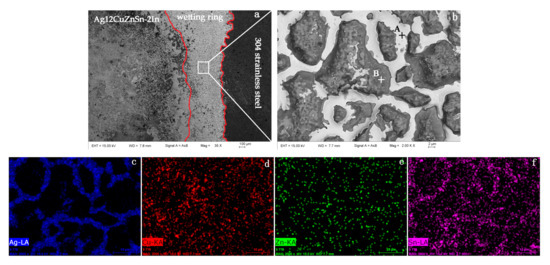 The high magnification SEM microstructures and the elements mappings of the substrate surface after the spreading test on 304 stainless steel using 12Ag–Cu–Zn–Sn–2In are shown in Figure 4, and the EDS of the points indicated in Figure 4 is shown in Table 2. It can be seen obviously that there is a wetting ring on the leading edge of the molten brazing alloy. As shown in Figure 4b, the wetting ring consists of a smooth white phase (named as A region) and a rough gray phase (named as B region). The elements mappings of Ag, In and Sn overlaps with A region, and Fe, Cr and Ni elements correspond to B region, combined with the results of EDS shown in Table 2, it can be concluded that A and B regions were composed of Ag–In–Sn alloy and stainless steel substrate, respectively. The preferentially spreading Ag–In–-Sn phase liquid alloy undergoes the mass transfer action, which reduces the surface tension between the brazing filler metal and the 304 stainless steel plate; that is, the “guide wetting effect” appears, which greatly improves the wetting performance of the brazing filler metal on base metal. Meanwhile, Kogi et al. [16] found that molten alloys containing mainly Ag and In spread preferentially on a Ni base plate, Ag and In, which are both constituents of Ag–Cu–In alloys, affect the wetting-ability of the filler metal.