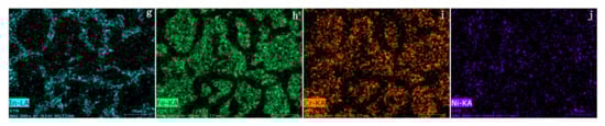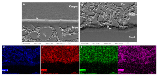 In order to further study the brazed interfaces and the microstructure of seam, high magnification SEM micrograph of microstructures of 12Ag–Cu–Zn–Sn–2In brazing joint and the elements mappings of the interface adjoin 304 stainless steel substrate were used, and the test results are shown in Figure 8. The brazing seam is mainly composed of the bulk grey phases (named as B or F region) and network-like white phases (named as C or E region). According to the results of EDS shown in Table 4 and the elements mapping shown in Figure 8c–j, it was indicated that F and E regions were composed of Cu-rich phase and Ag-rich phase, respectively. Similar results were reported by Cao et al. [20] when the intermetallic compounds formation between brass/steel and Ag–Cu–Zn–Sn filler metal was investigated. In addition, it can be clearly seen from the results of EDS that the content of Ag and Zn in the D region is much lower than that in the A region, which indicates that excellent metallurgical bonding is obtained between the novel brazing alloy and the copper substrate.